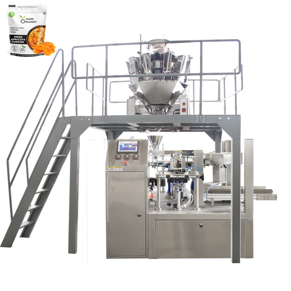 Mašina za pakovanje sa rotirajućom torbom sa različitim dozama (kao što su višenamenske vage, punjač puža, tečno punilo itd.) mogu biti pogodne za automatsko pakovanje za granulat, prašak, tečnost, pastu itd.