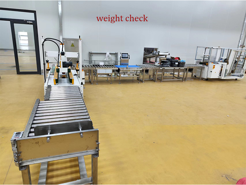 Nakon punjenja vrećica smrznutom hranom, svaka vrećica se ponovno provjerava detektorom težine kako bi se osiguralo da težina odgovara ciljanoj težini, a zatim prolazi kroz detektor metala kako bi se osiguralo da se u svaku vrećicu ne miješa metal. Vreće se zatim transportuju do linije za punjenje kartona.